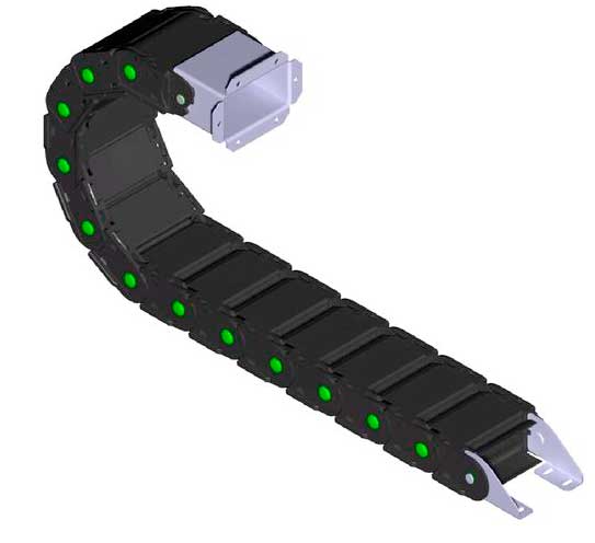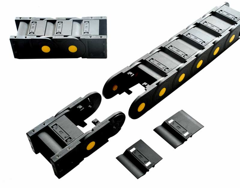 全封閉塑料拖鏈采用可拆卸的橋式接件,從頂部和底部快速鉤住和取下鉤子,所有中心都有橋梁。