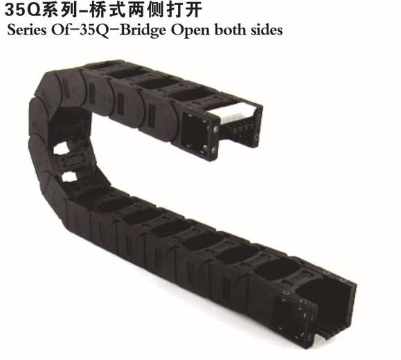 尼龍拖鏈的安裝有兩個步驟,第一:把需要內(nèi)置的電線電纜放入拖鏈內(nèi),第二:把拖鏈固定在設(shè)備上面。